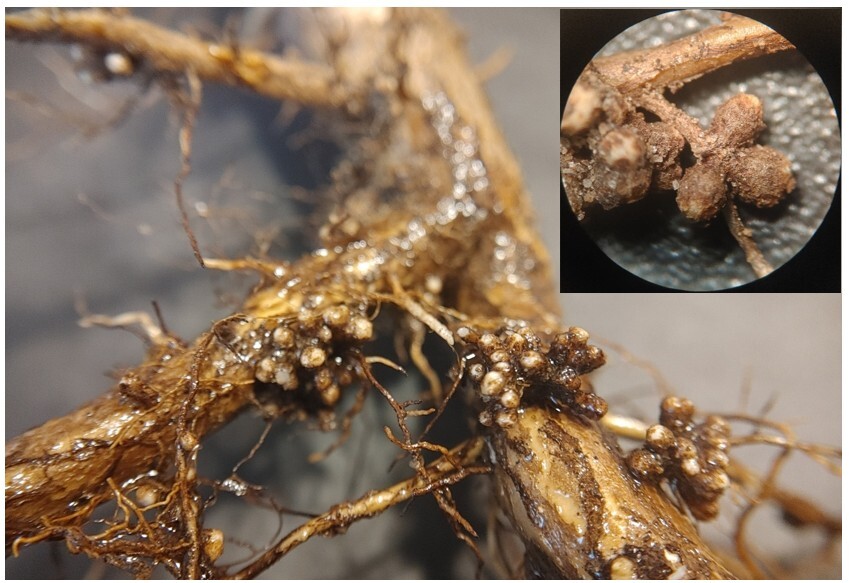 The round clusters shown here are root nodules of an autumn olive shrub. Symbiotic Frankia bacteria live in the root nodules, making nitrogen readily available to the plant. Inset: a view of root nodules through a microscope at 60x magnification.