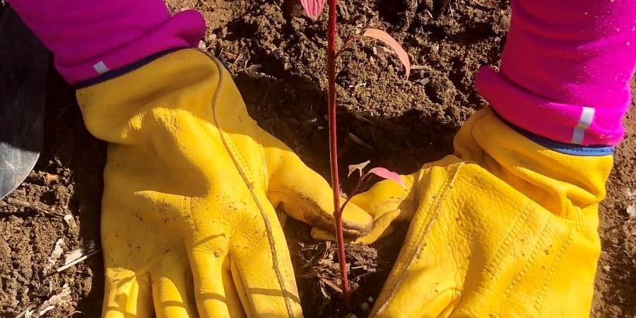 Volunteers assist staff with planting acorns, the beginning of mighty oak trees that will hold stream banks in place.