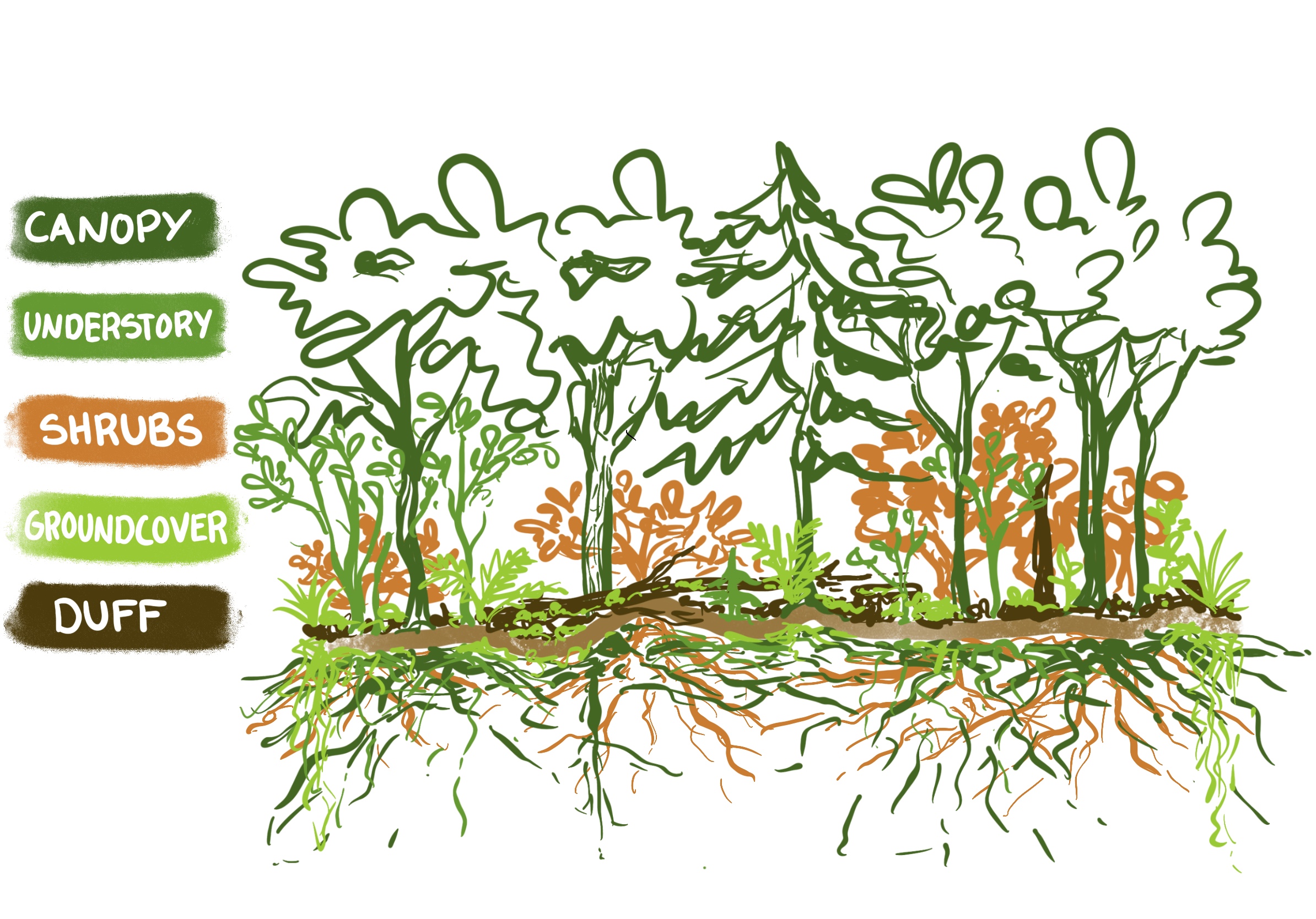 A healthy streamside includes five “layers”: duff, herbaceous growth, shrubs, understory, and canopy.